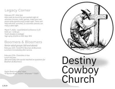 Our worship service, events, and other gatherings are centered around a Western heritage culture. Our atmosphere is relaxed, and we hope it feels like home. Hats, boots, and jeans are the norm for some of us, and others just dress casually. Just come as you are to worship with us and praise the Lord! Our music is a mix of country, gospel and old hymns, and worship songs. We are always looking for others who want to use their talents and God given abilities to serve, so let us know if you play an instrument or want to sing. We are praying for God to bring us people who want a loving church home and can help us become the vision that God gave us when we started this church years ago. We have a strong desire and need to reach the lost and hurting in our community. If you want to love people, serve others, and get fed spiritually, then come and join us! We are always looking to make new friends!